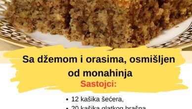Sastojci Biskvit sa orasima (za pleh 20×30 cm):6 belanaca3 žumanca150 g šećera150 g mlevenih oraha2 kašike brašna1 kašičica praška za pecivo1 kesica vanilin