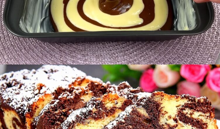 • Naizmjenično sipati kašike bijele i čokoladne smjese u kalup da se stvori marmorni efekt. Lagano zavrtiti čačkalicom ili nožem za lijep uzorak.