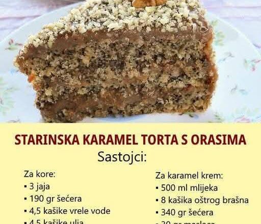 Kore filovati ohlađenim karamel kremom, premazati celu tortu odozgo i sa strane i dekorisati po želji. Ja sam je ukrasila po starinski, mlevenim orasima i jezgrima oraha.