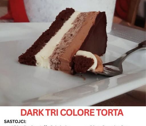 Treći sloj kreme (čokoladni): Treći dio kreme obogatite rastopljenom Dorina Jaffa čokoladom (ili sličnom), koju lagano umiješajte dok se ne sjedini boja i okus. Premažite preko drugog sloja. Za što ravnije i urednije slojeve preporučujem slaganje torte u prstenu/obruču — on pomaže da se svi slojevi poravnaju i stisnu ravno.