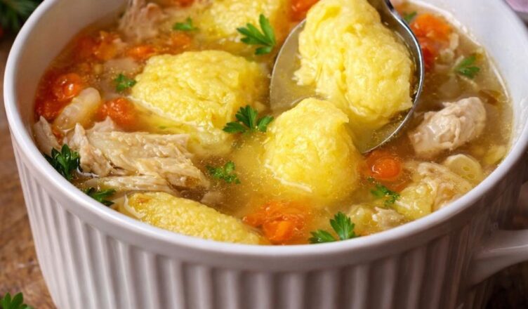 Pripremiti smesu za knedle. Umutiti jaje, dodati so, prašak za pecivo, griz, sjediniti, pa dodati i ulje i ponovo dobro izmešati. Vrućom kašičicom zahvatati i spuštati knedlice u vrelu supu. Kuvati još 10 minuta.