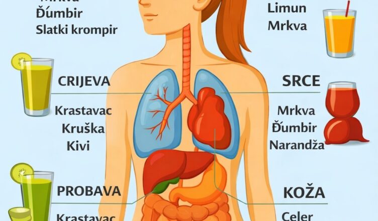 Svježi sokovi od voća i povrća mogu pružiti snažne hranljive tvari koje podržavaju različite organe u tijelu. Infografika prikazuje kako određeni prirodni sokovi mogu pomoći u poboljšanju zdravlja pluća, srca, kože, probave i drugih sistema. Redovno pijenje ovih sokova može biti jednostavan način da u svoj dnevni rutinu dodate vitamine, antioksidanse i minerale.