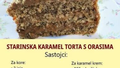 Sastojci Sastojci za kore:3 jajeta190 gr šećera4,5 kašike vrele vode4,5 kašike ulja120 gr brašna150 gr mlevenog oraha1 kašičica praška za pecivo sastojci za