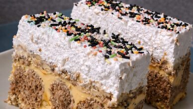SASTOJCI Za koru (2 iste kore – donja + gornja):250 g brašna150 g šećera1 prašak za pecivo200 ml mineralne vode100 ml ulja1 vanilin [...]